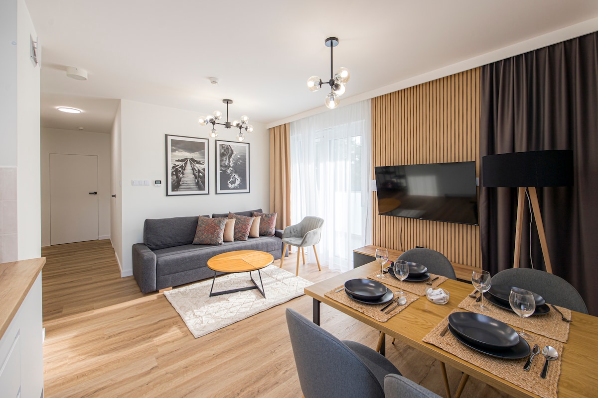 12 November - 04 December Pools and saunas closed. We apologize for any inconvenience. Luxurious, fully equipped 2-room apartment in the Aqua Polanki complex, ~350 m from the beach. Price includes free access to Wellness (heated 25 m pool, leisure pool, kids’ pool with slide, jacuzzi, saunas), fitness, kids’ playroom, outdoor areas, viewing terrace, and parking. 200 m to a 60 km seaside cycling network. Dog beach nearby.
