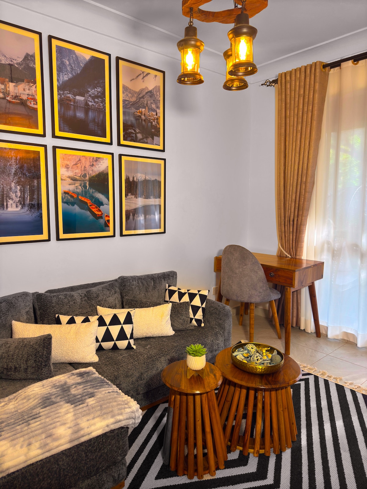 Experience a chic modern 1-bedroom retreat on Bukoto - Kisasi Rd. This fully furnished apartment boasts a spacious layout, king size bed, well-equipped kitchen complete with a coffee maker, blender. It is beautifully designed with stylish décor and top-quality fittings. Our onsite caretaker ensures a clean apt for relaxation and is ready to help with your requests. Located just 5min from Kabira Country Club in an accessible area it's perfect for exploring the city or unwinding after a busy day.