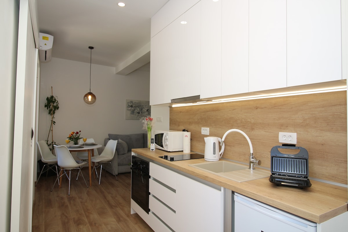 Brandnew renovated "CARPE DIEM Studio FOUR" with free parking, private bathroom, fully equipped kitchenette, microwave, aircondition, fast wifi, sat-tv, etc...only 10 minutes walk to the old town, the city beach and the main bus station...a post office, shops, supermarkets, local green market, bakery, coffee bar and a bank are only steps away...best location ever - just book it!