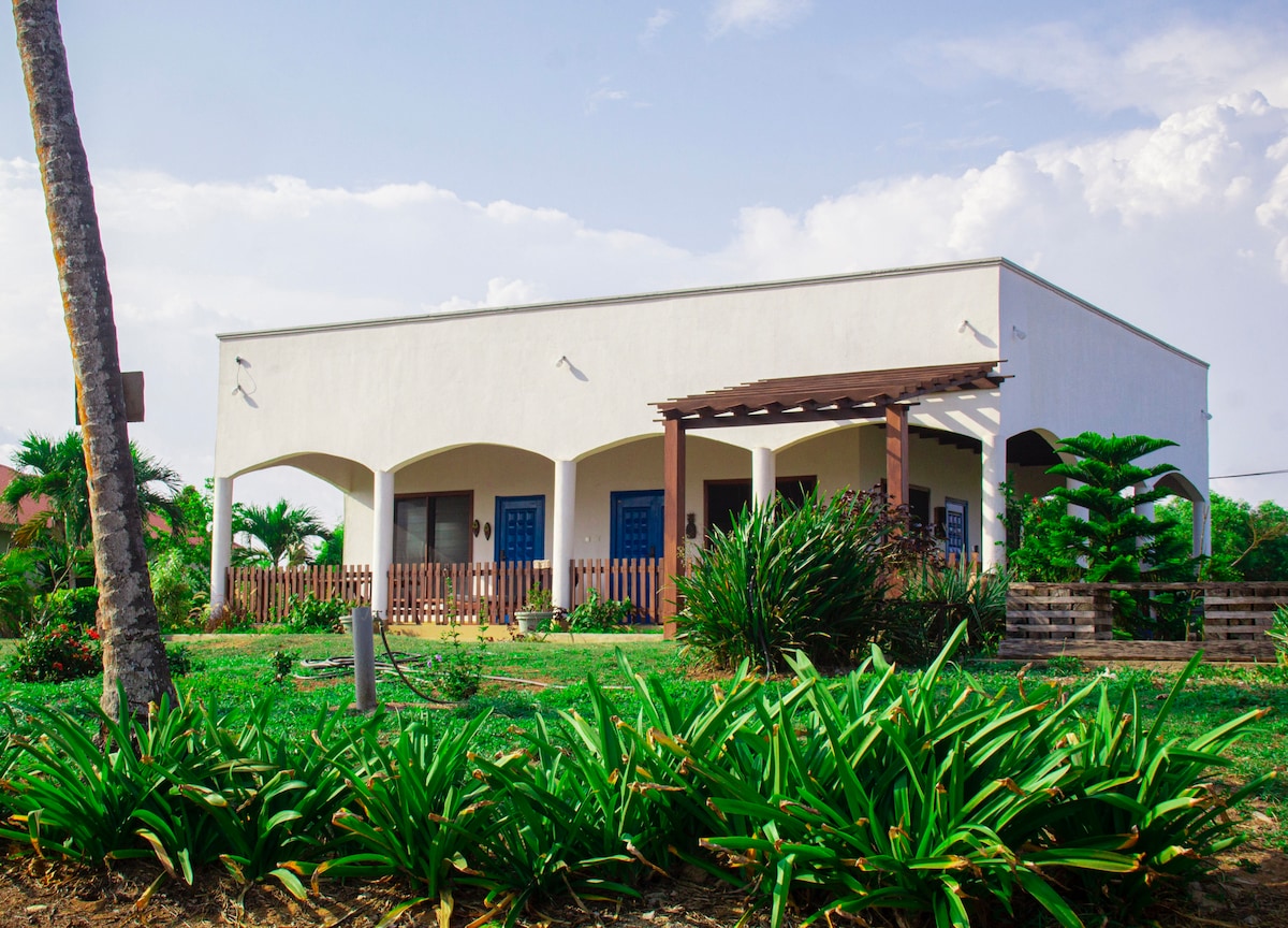 Escape to THE BLUE HERON, your tranquil beach cottage on Ghana’s Atlantic coast. Nestled on the outskirts of Elmina, this coastal hideaway blends rustic comfort with authentic West African charm. Relax on the breezy veranda surrounded by coconut palms, tropical greenery, and artistic accents that balance elegance with simplicity. Step inside to airy, high ceilings and natural light showcasing vibrant art work and artisanal pieces, curated to connect you with the spirit of the Gold Coast.