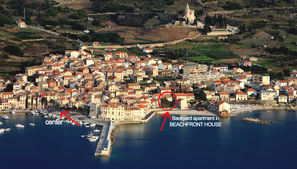 Our house is located near the sea and a pebble beach, and near the town center. The apartment has two rooms that are each equipped with 2 double beds. The apartment’s size is 75m2, it has one bathroom and one toilet. The apartment has a satellite TV, a washing machine, a refrigerator and air-conditioning. The apartment has a large terrace with a beautiful view of the bay, the city of Komiža and the open sea. Their is a public parking spot about 80m from the house.