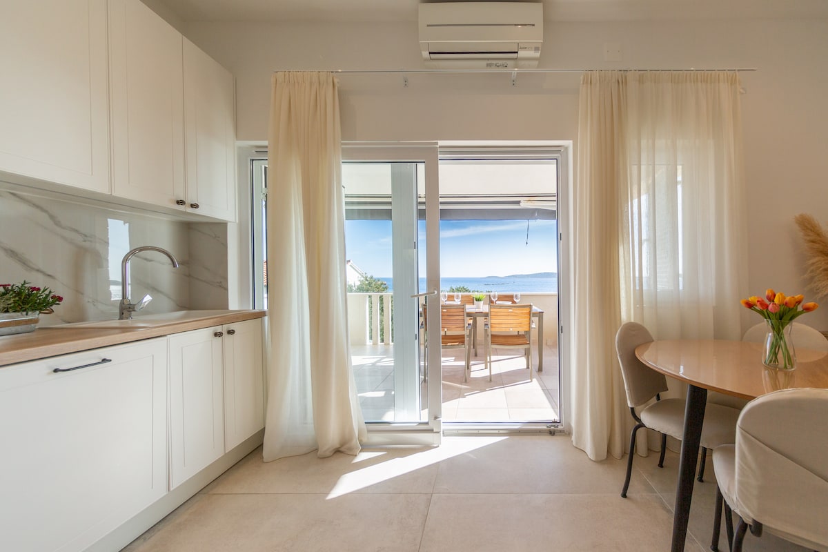 Zanicovo beach apartment is a brand new 2 floor studio apartment (26m2) situated on the beach in a great central location near everything for walking distance. Bedroom and bathroom are located on second floor and from bed you can see the stunning blue waters of Adriatic sea. Kitchen, dining room and small bath are situated on ground floor that has a direct access to an outside patio terrace with table and chairs. It has all brand new amenities