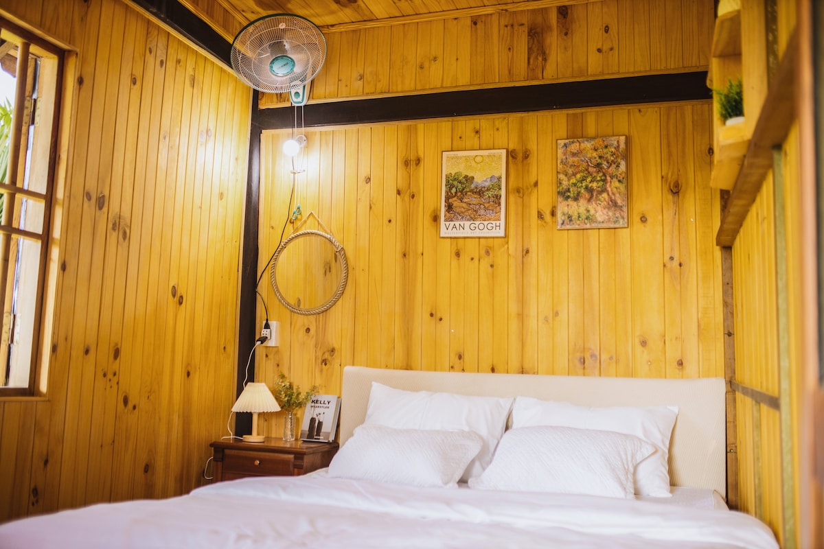 Our wooden house is located in Kon Vong Kia village, built in the traditional Mơ Nâm style. From here, you can see the beautiful hanging bridge and terraced rice fields. The house also serves as a small library for the children in the village. To get there, you’ll walk up a hill and find two cozy homes surrounded by forest. In the evening, you can gather around a fire, stargaze, and watch fireflies.