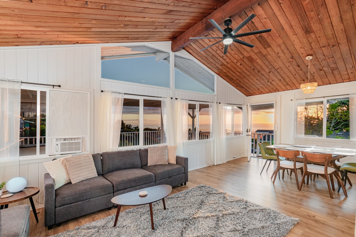 This is a comfortable 2 BD/2BA with rustic modern & eclectic decor, situated on a beautiful private acre of lush greenery. The living area is an open concept kitchen & living room with grand floor-to-ceiling windows showing off views of famous Mauna Kea. The generously sized master bedroom has a brand-new Avocado cal-king bed and a second bedroom offers a cozy queen. With a fully equipped kitchen & amenities, this is a perfect home base from which to begin or continue your Big Island experience!