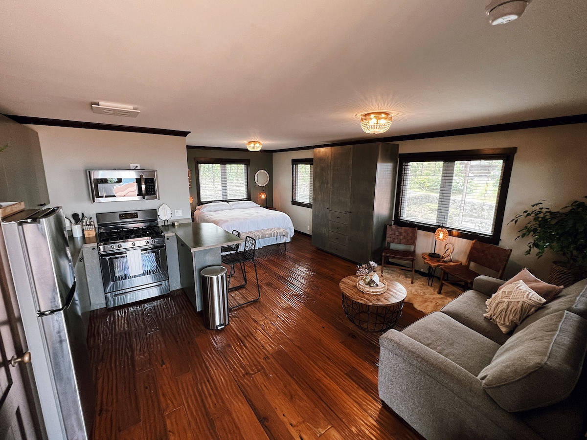 Step into The Ohia, a 500 sq. ft. poolside one-bedroom suite with boho textiles and natural accents. Featuring a private entrance, a large open living space, kitchenette, and a private lanai, The Ohia is the ideal place to immerse yourself in laid back Hawaiian living. The suite spans the lower level of The Koi House, set beside a nature reserve that echoes a relaxed way of life. The Ohia is the perfect home base for all of your adventures and a 10 minute drive from the heart of Kailua-Kona.