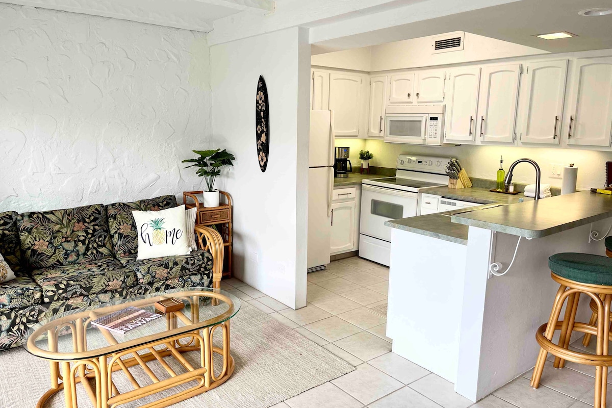 ENJOY OCEAN VIEWS from a newly renovated Stylish condo in one of Kona's most desirable locations. Condo is an apx 6 to 8 min walk to a variety of Ocean Side Restaurants, entertainment and a quick walk to Honl's Beach. No rental car is needed, you are a short walk to town. The condo looks directly out to the Pacific Ocean and is on the ground floor so (no long stairs to climb). FREE dedicated parking spot! Free parking is so IMPORTANT in KONA now! 65" SMART TV, AC, our SOFA folds to a 2nd bed.