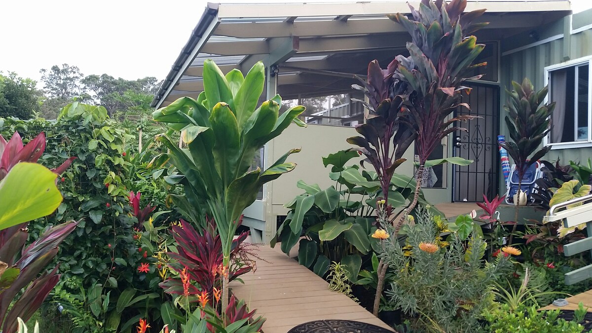 Beautiful, peaceful, jungle vibes, surrounded by nature, 15 min from the center of Kona, up on the mountainside, lush lot w/ fruit and mac nut trees! The ADULTS-ONLY space has an open floorplan, with high ceilings and lots of room. Luxury memory foam King bed, two front lanais, nice Weber grill, big Samsung TV with cable, Wifi, shared washer and dryer, and a great kitchen with all the amenities. Also: beach towels, chairs, cooler, & umbrella! This Private space is the largest unit of the home.