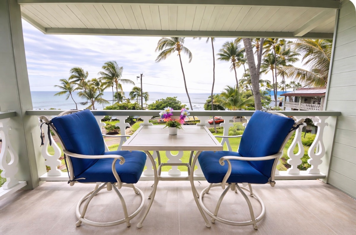 ALOHA! We invite you to sit back, relax in this spectacular view from our lanai. Absolute BEST location with direct ocean front view at historical Alii Drive. This unit has a tropical theme and is 15 minutes from the Kona airport and 1 minute walk to the ocean!! FAST INTERNET - for those of you decided to escape to paradise to work!! Kitchenette with pots and pans, plates and cups and wine glasses. Kona Town right next door with open air. eateries, live music, outdoor market next. door.