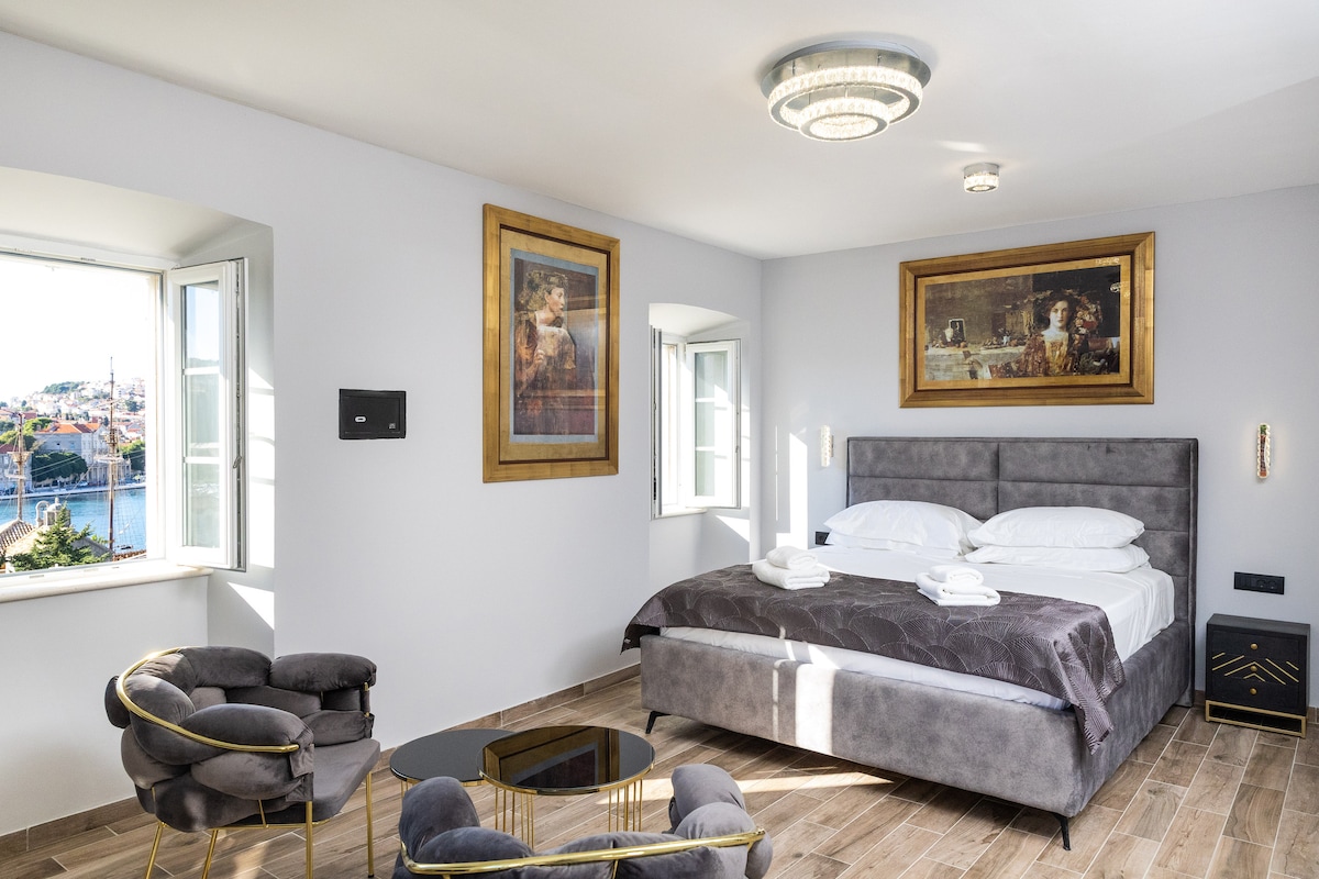 This charming room with furnished balcony is placed in the attic of the family house that consists of 5 guest rooms. There is a double bed for two in it and a sofa bed. The room is air conditioned and equipped with TV, a fridge, kettle and free Wi-Fi. It has its private well- equipped bathroom placed in the hallway (towels, shower gel, shampoo provided). From its private balcony you can enjoy the breathtaking panoramic vistas of Dubrovnik surroundings and the sea.