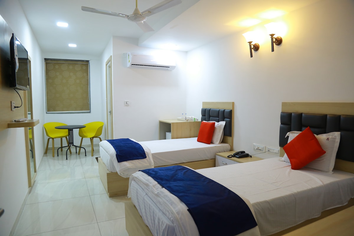 The Triple Sharing A/C Room with great ventilation offers three comfortable beds, a private bathroom, and access to an open terrace. Guests benefit from high-speed WiFi, Smart TV, an instant 10L geyser, electric kettle with coffee/tea sachets, 24/7 power backup, and direct lift access. Suitable for up to three members, it is ideal for long stays, medical visitors, and group travelers.