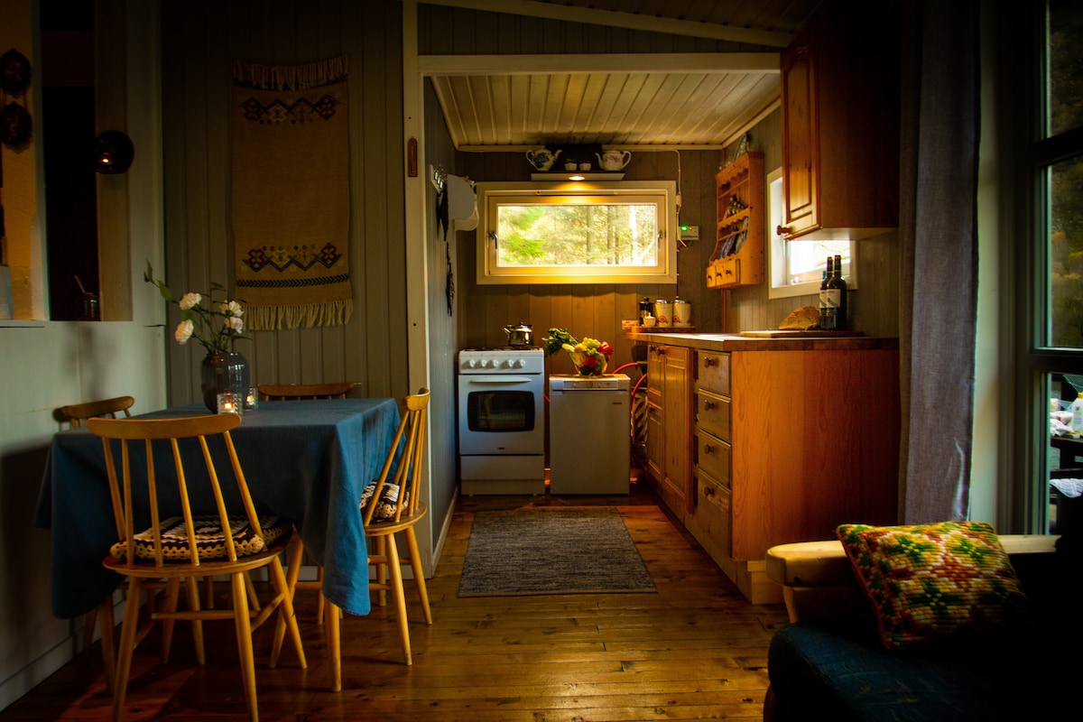 Dette er ei eldre hytte med enkel innredning og strømforsyning med solcellepanel. Det er mulighet for lading av mobil i USB uttak.Det er peis med vedfyring,mulighet for grill,kjøleskap,og komfyr/koking med gass. Det er tallerker,skåler,glass,kopper og bestikk, ostehøvel,og boksåpner.Det er ikke innlagt vann,så vi fyller opp vanndunk med rent drikkevann,som kan brukes til både matlaging og til oppvask Det er satt opp utedo utenfor hytta Leie av sengtøy 150,- pr.sett pr.person Ved 120,- pr.sekk.