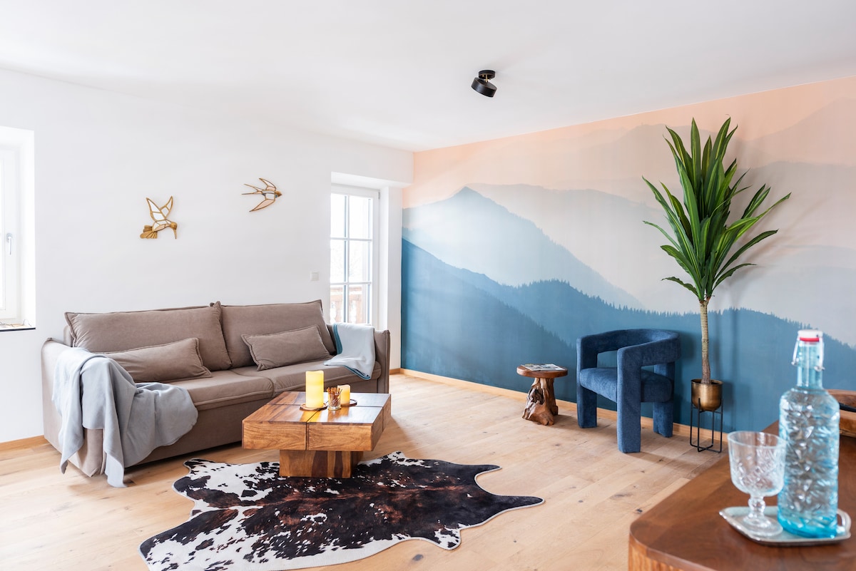 Renoviertes Appartement (ca 35 qm) im natürlichen Stil. Tolle zentrale, trotzdem ruhige Lage. Spaziere zum Königssee & genieße den tollen Bergblick. Einkaufsmöglichkeit, Bäcker, Freibad, Restaurants und Cafés sowie Bushaltestelle in unmittelbarer Nähe. Completely renovated apartment (approx. 35 sqm) in central village. Calm & cozy! Connection to busses, stores, swimmingpool, cafés and restaurants nearby. Take a walk to lake Königssee & enjoy beautiful mountain views.