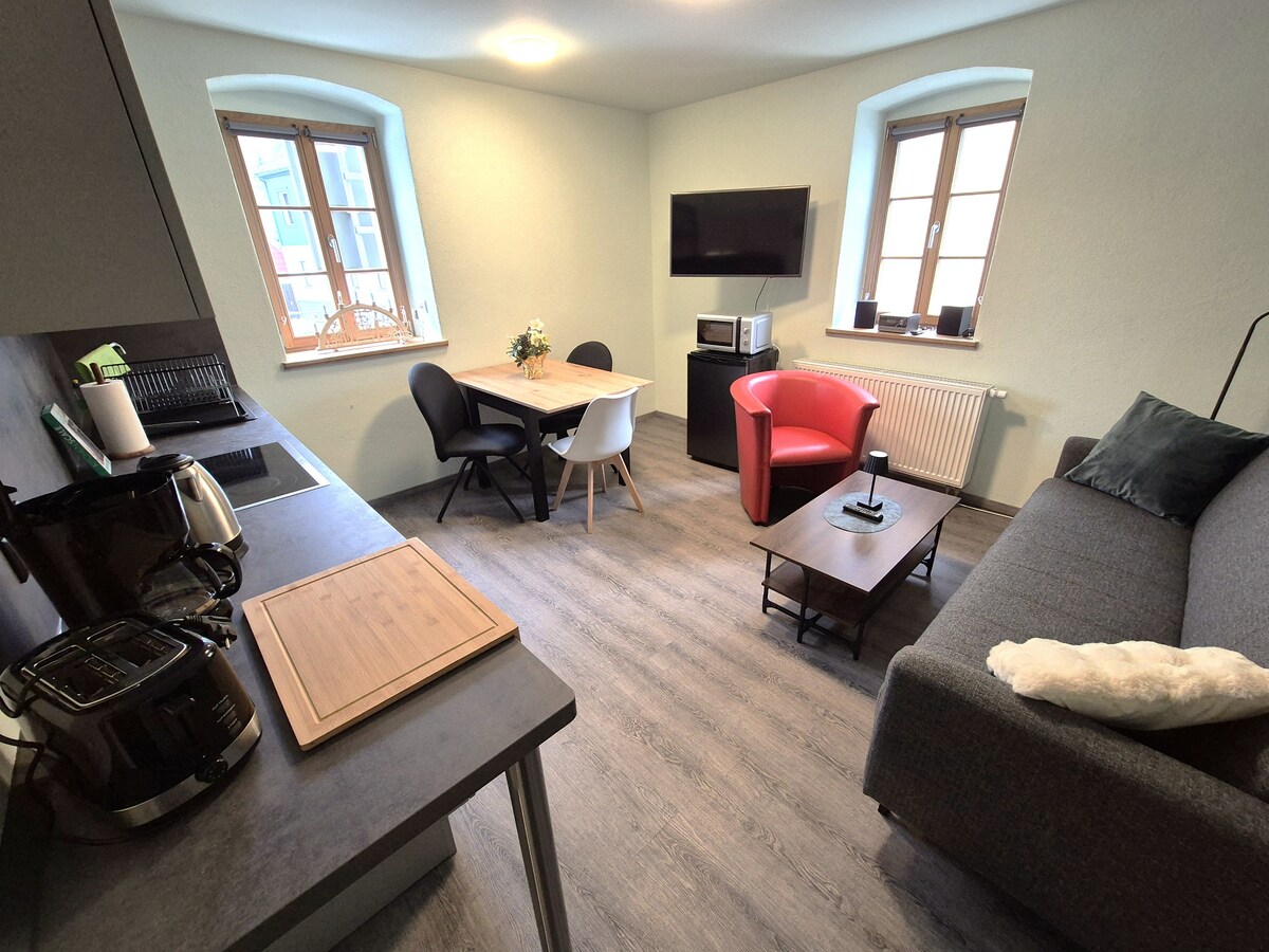 Sehr stylisches und in Zusammenarbeit zwischen Architekt / Innenarchitekt / Möbeldesigner realisiertes 1-Raum-Appartement (Schlafsofa!) mit separatem Duschbad, 31qm Wohnfläche, separatem, eigenen Eingang und Zugang zur Fasssauna. Alle Möbel als individuelle Sonderanfertigung, Küchenarbeitsplatte und Essbar Beton/ Holzeinlegearbeiten/ Epoxidharz. Duschbad mit Betonspachteltechnik, wobei aufgrund der sehr eingeschränkten Platzsituation Dusche und WC räumlich nicht getrennt werden konnten.
