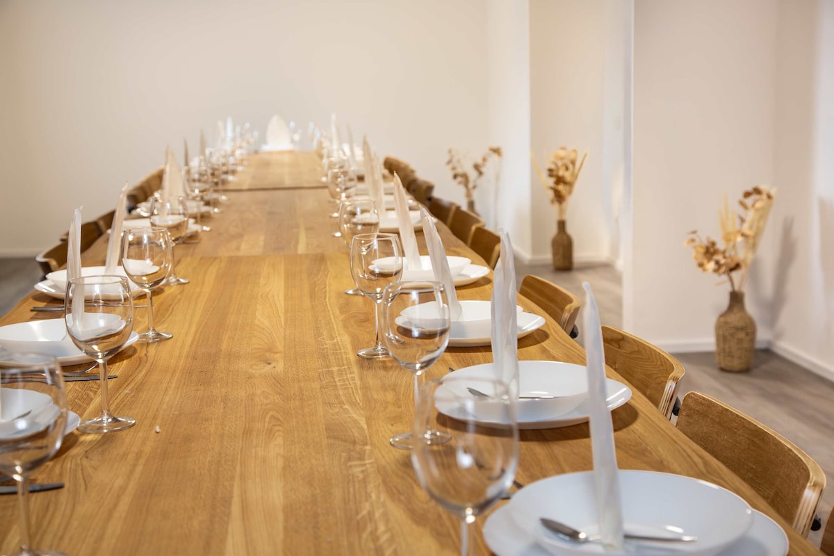 Our house is on the edge of the village, surrounded by old trees with a large garden. It is only 45 minutes away from Cologne. It offers enchanting, stylishly furnished rooms, wonderful niches and retreats. You can linger and relax in the garden and in the forest. We are surrounded by wonderful nature and enchanting villages. Our house is also ideal for day workshops and offsite meetings. Projector, screen and flipchart are available.