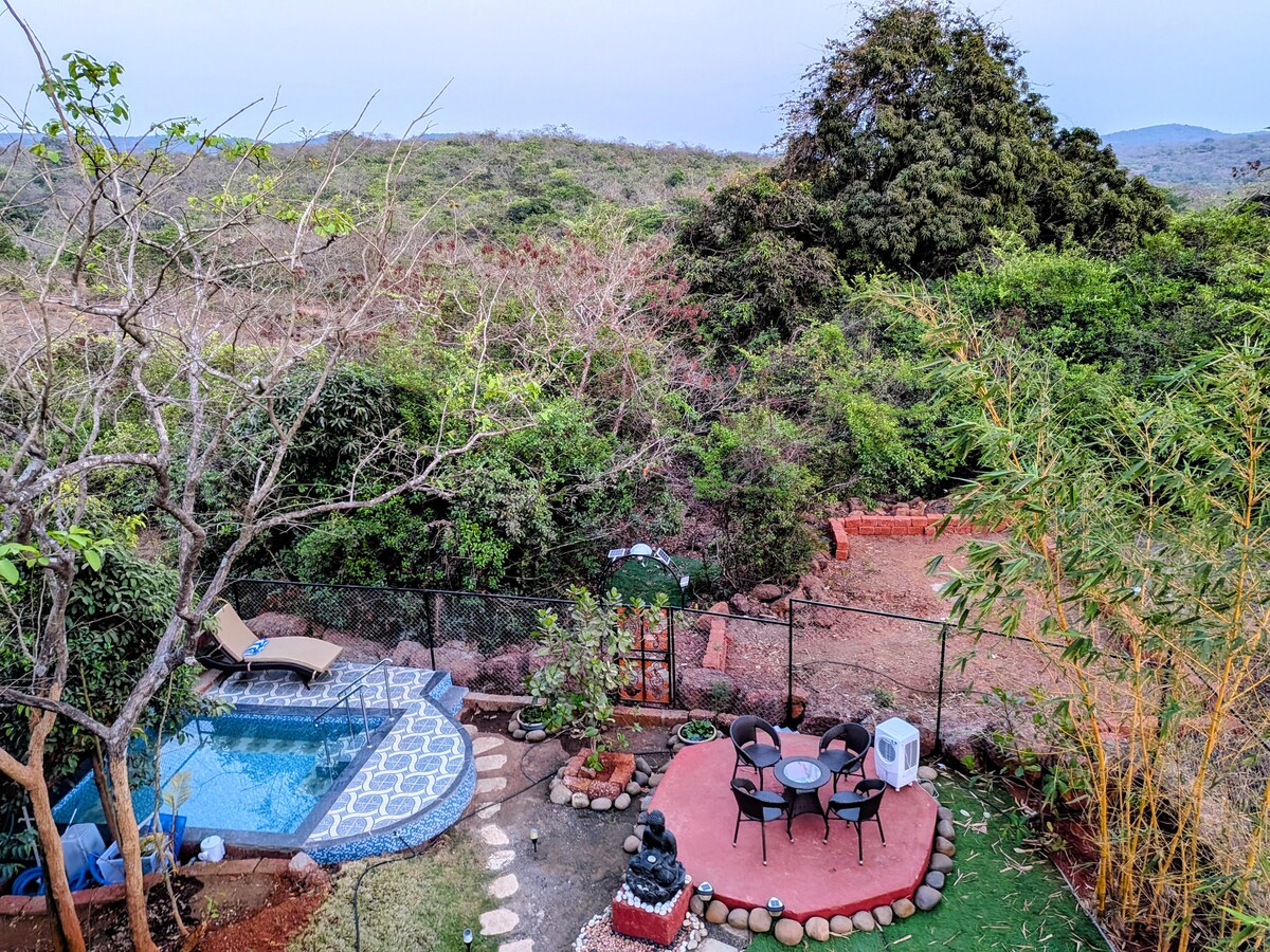 Dharaa – your serene retreat nestled in the Western Ghats. This 2BHK G+1 villa offers serviced luxurious stay. Best suited for family of five. Step into luxurious backyard to enjoy fountain pool in the garden sit-out adjacent to the jungle. Unwind in Jacuzzi bath. Fully furnished kitchen with dining area, local food delivery (menu available) & barbeque facility. Take a calming walk to jungle leading to river stream or just drive for 20 min to Kolthare beach or Parshuram Bhumi.