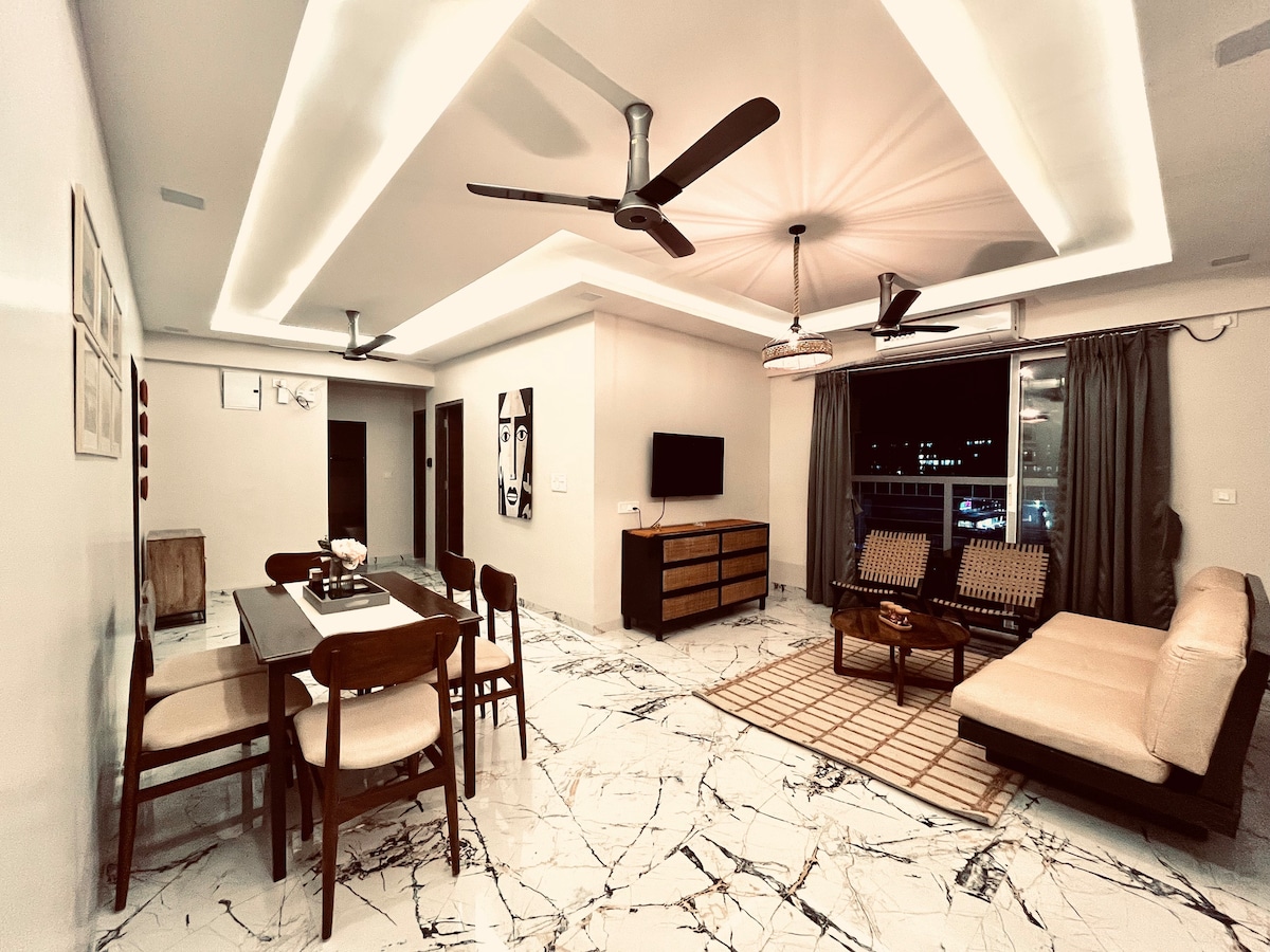 Bright & spacious 1BHK apartment with high ceilings, tall European-style windows, a fully equipped kitchen & 2 bath. Steps from Farmer’s Café,Linking Road, & auto-rickshaws — in one of India’s coolest neighbourhoods. • 1st floor flat • African themed interiors • 1 spacious bedroom with 2 bathrooms • Balcony • Split AC in living room & bedroom • 43" Smart TV • Hi-speed Wi-Fi • Valet Parking • Airport ride, meals & other services avail