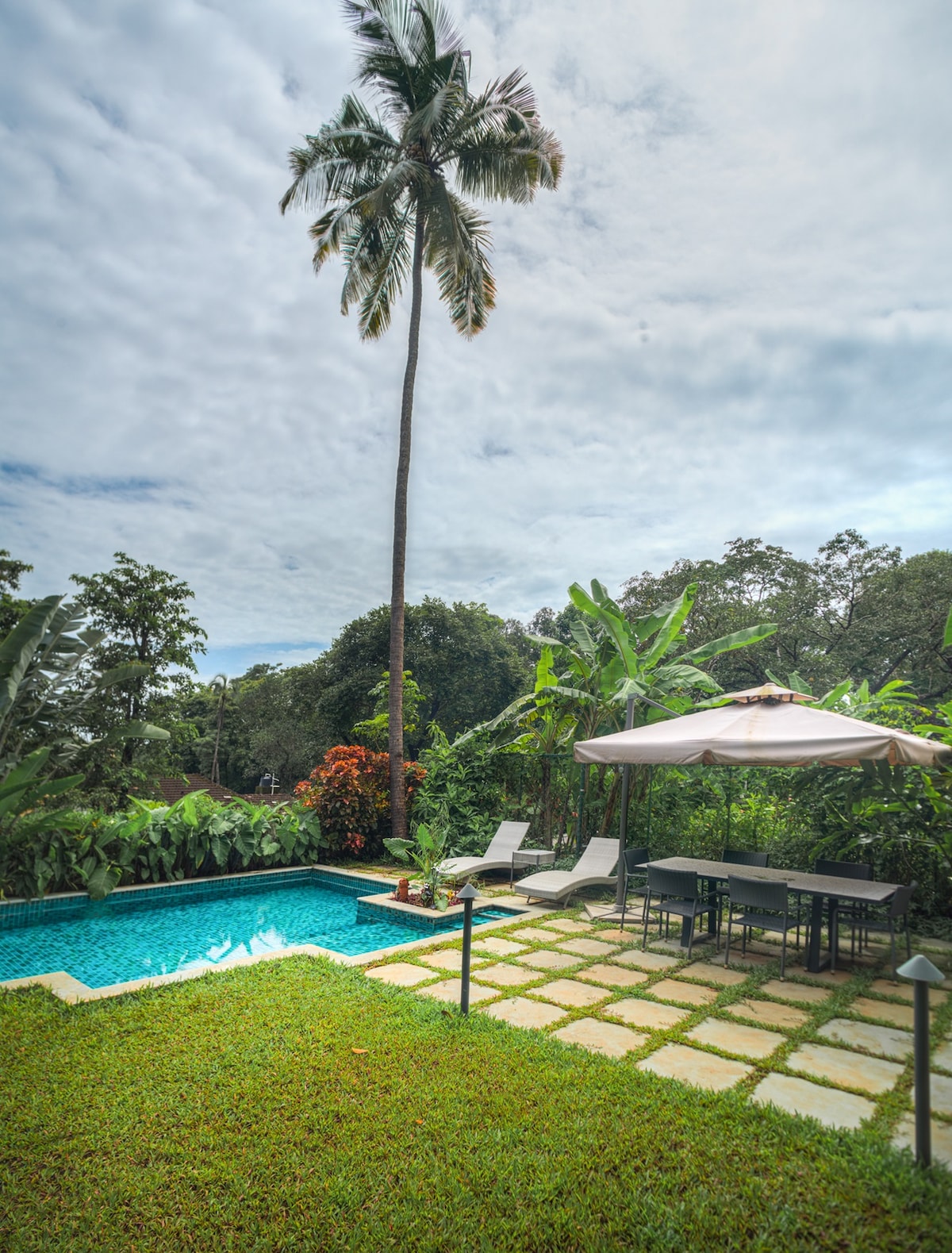 A beautiful 4 bedroom wooden villa with hydro pool situated in a prime locality in the heart of Siolim. It's a well lit & completely furnished villa with a living room, functional pantry and a private sit out area surrounded by greenery on all sides . It's very close to the famous Vagator & Morjim beach and Chapora Fort making it a great home base, while exploring all that Goa has to offer. There are multiple restaurants, wine stores and supermarkets around to suffice all your vacation needs.
