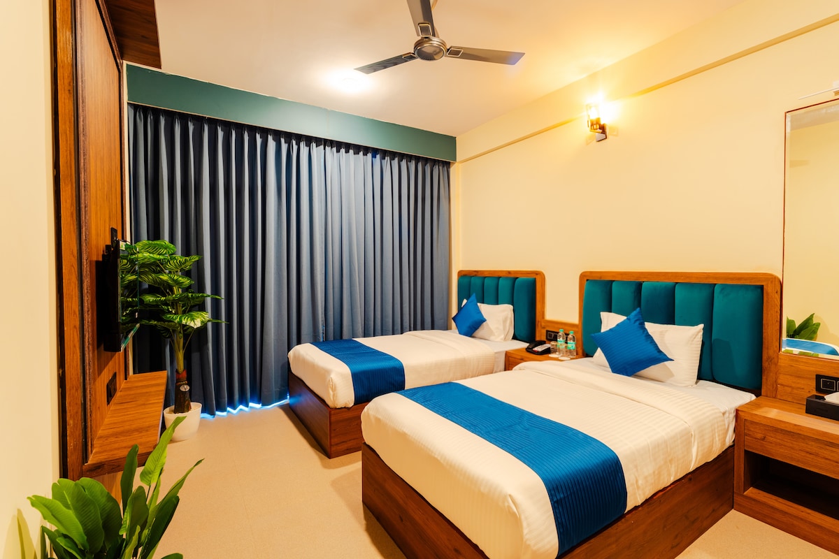 The Classic Rooms at Jumbo Serene, Panchgani offer a cozy, retreat perfect for couples or small families. (these rooms are on ground level) With easy access to the hotel’s large swimming pool, guests can enjoy swimming The property also features fun indoor games like chess and carrom, along with a peaceful garden area for relaxing strolls. To complete your stay, enjoy a meal at the on-site restaurant with scenic views of Panchgani’s natural beauty, making it an ideal destination for leisure.