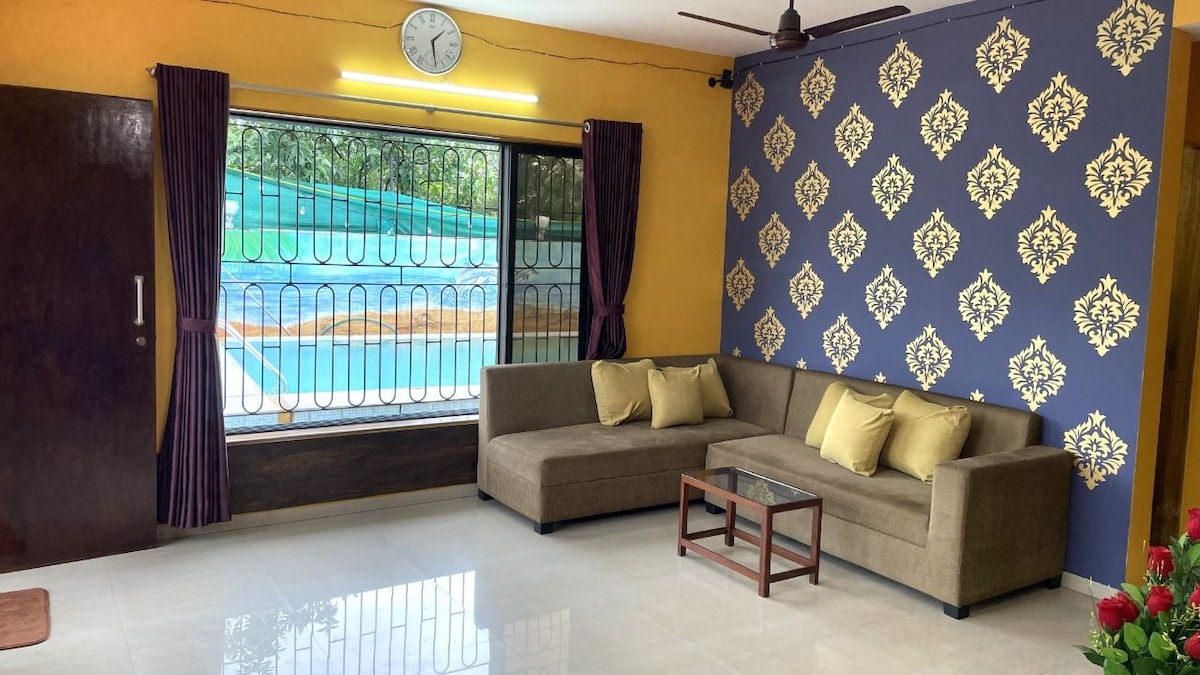 Relax with the whole family at this peaceful place to stay. A lovely 2 BR property in the midst of nature. 2 King-size beds (sleeps 4). 4 extra mattresses. Air-conditioning in both bedrooms and living room. A kitchenette consisting of tea-coffee maker, micro-wave oven, refrigerator, a set of 12 plates, glasses etc. TV+DTH. Lush 3000 sq ft of lawns. Free Parking for 6 cars. Outdoor sit-outs with beautiful views. Indoor Board Games. Bluetooth Karaoke Speaker. Inverter back-up for lighting load