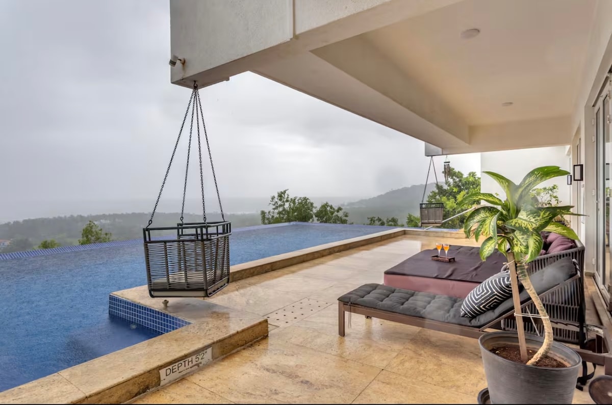 'Villa Elsewhere' is a luxurious, beautiful, private pool villa, just 60-90 mins drive from Mumbai. Surrounded by lush green views of fields, hills, and sounds of nature. The Villa has 3 AC en-suite bedrooms, a large AC living room that opens into a private pool and large deck with a Bar. The kitchen is fully equipped where a chef can make delicious meals (*extra charge). It is pet friendly (*extra fee). BOOK to relax in a calm peaceful vibe, for a get together, or to host the best part ever!