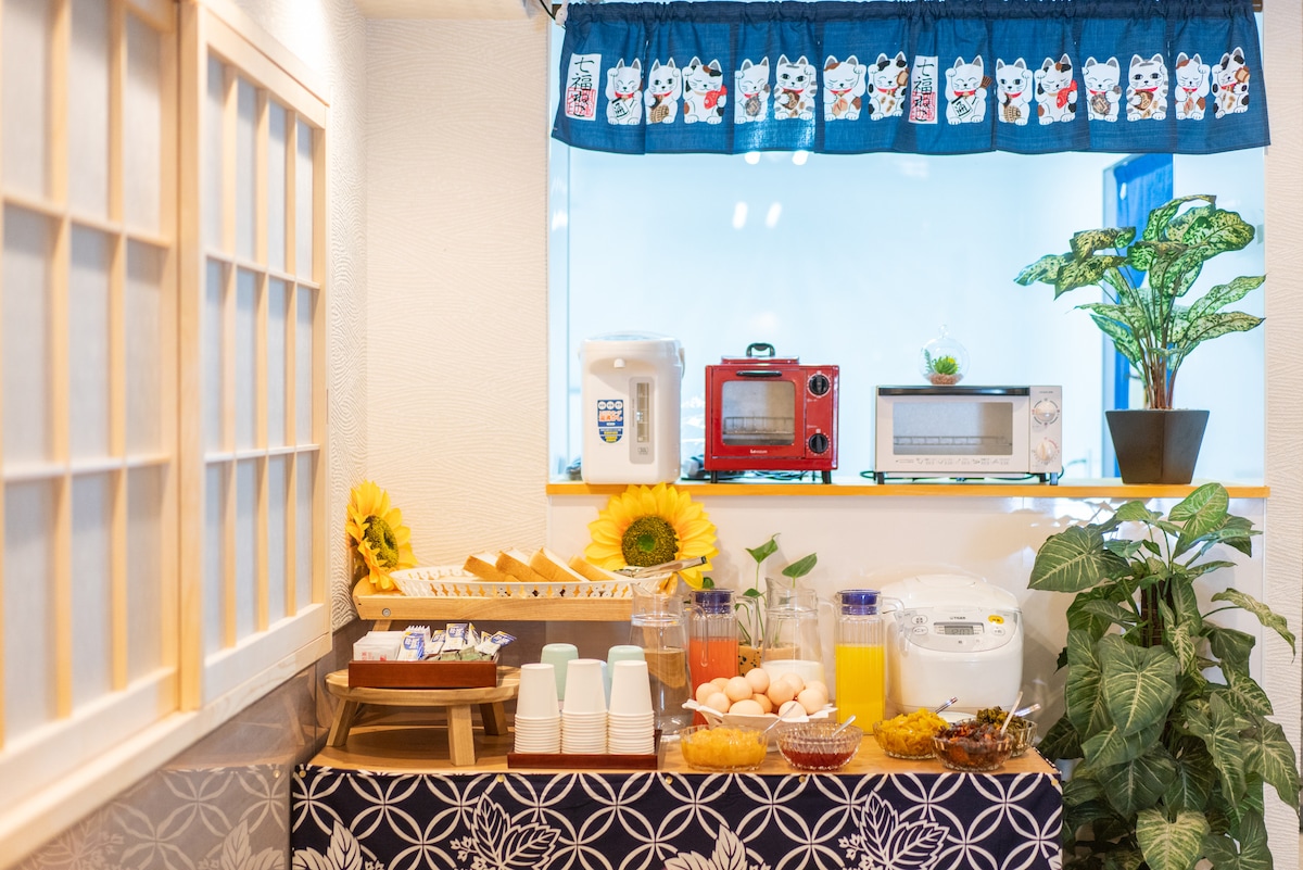 这家旅馆地理位置优越,方便前往难波、梅田和天王寺等主要旅游景点。 这间完全私密的客房非常适合团体和家庭入住,一楼设有餐厅,二楼有四间卧室。我们还提供免费早餐 特征 ・位于安静的住宅区,步行5分钟即可到达大型超市和便利店。 整栋房屋最多可容纳8位客人(提供8张单人床)。 配备Wi-Fi和智能电视上的免费Netflix。 ・提供免费早餐。 ・房东就住在隔壁,您可以放松身心,享受宁静。 ・房东会说日语、英语和韩语。 ・已获准在大阪市特别区域内提供私人住宿服务。 从大阪地铁花园町站步行约10分钟,从天茶屋站乘坐出租车约7分钟。如果您直接从机场前来,我们建议您从天茶屋站乘坐出租车。 *酒店没有出租车候客点,请使用打车软件。 作为一项特别活动,凡在谷歌地图或预订网站上撰写评论的客人,我们将提供每人500日元的出租车费补贴(6岁以下儿童除外)。 *此优惠仅限您入住最后一天。请在早餐时出示您的评论。