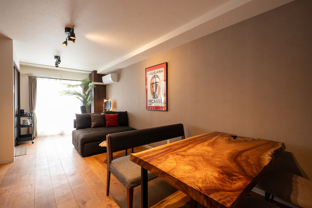 Calm apartment in Osaka, ideal for sightseeing, remote work, and long stays. 3-min walk from Kamishinjo Station (Hankyu Kyoto Line). 13 min to Umeda and 14 min to Shin-Osaka. 24-hour car rental behind the building. 1-min walk to a popular bakery. ¥500 daily bread ticket. Custom live-edge wood dining table. One double bed + one double sofa bed (up to 4 guests, 3 recommended). Fast WiFi (350Mbps). Netflix & YouTube. Note: A bullet train passes nearby, but noise is minimal with windows closed.
