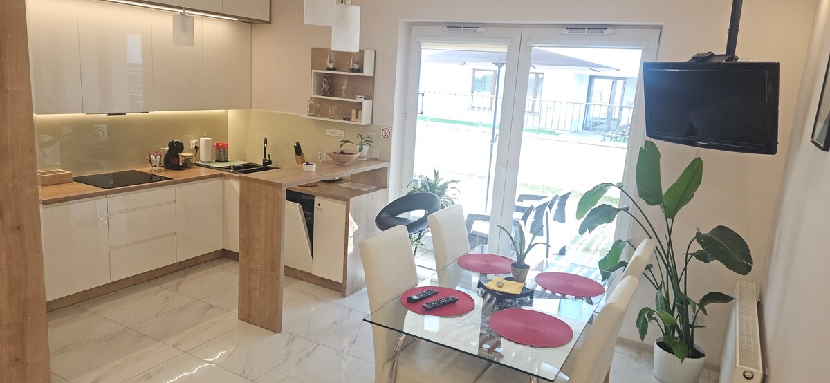 Apartament usytuowany jest na 1 piętrze nowo wybudowanego budynku. W pobliżu znajduje się plac zabaw. Kompletnie wyposażona kuchnia i łazienka, (pościel, ręczniki, szampon, żel pod prysznic). W apartamencie znajduje się lodówka, kuchenka mikrofalowa, płyta indukcyjna, piekarnik, pralka, telewizor 55 cali, aktywna usługa NETFLIX, sprzęt do prasowania. Na wyposażeniu kuchni znajdują się: wszelkiego rodzaju naczynia, sztućce, garnki oraz patelnie, kawa, herbata, ekspres do kawy na kapsułki.