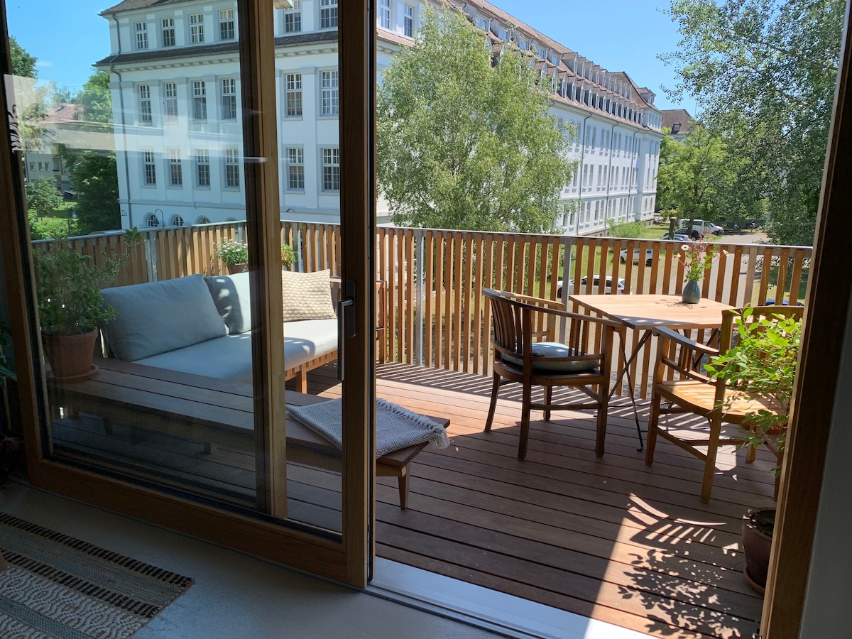Lehne dich zurück und entspanne dich in unserer stilvollen Wohnung. Ideal geeignet als Basis für Entdeckungsreisen am Bodensee oder das gemütliche Erkunden von Konstanz: Am ruhigen Stadtrand gelegen bist du entweder direkt am See (5 Minuten zu Fuss), oder rasch in der Konstanzer Altstadt. Und zum Waldspaziergang musst du nur die Strasse überqueren! Abends geniesst du dann auf dem ausgebauten Treppenabsatz einen Bodensee-Wein oder unsere Panorama-Küche. Wir freuen uns auf dich!