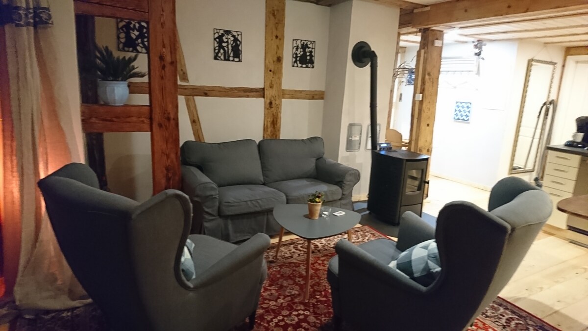 Die Wohnung ist in einem alten Bauernhaus (anno 1833) neu hergestellt worden. Bei der Erstellung wurde darauf geachtet möglichst viele Naturbaustoffe zuverwenden (Holz, Lehm, Hanf). Die Zwischenwände wurden als Fachwerkwände ausgestaltet. Das Wohnzimmer bildet mit der Küche einen Raum. Die Wohnung hat ca.60 m² und ist barrierefrei hergestellt.