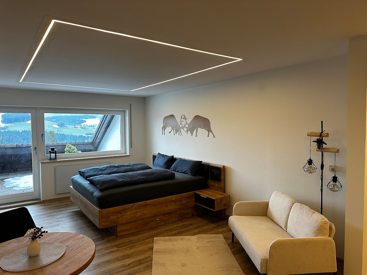 This bright top-floor apartment features a cozy living area with a sleeping nook, a desk, and plenty of natural light. The fully equipped kitchen with a dining area combines style and functionality. The spacious balcony offers stunning views of the city and mountains. The modern bathroom with a bathtub ensures comfort. A free parking space is available. Shops, restaurants, and the train station are nearby, while Lake Constance and the Festival Hall are about 1 km away.