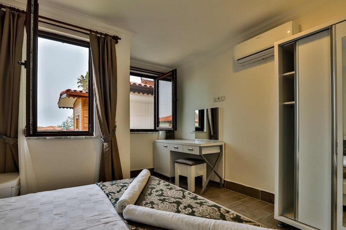 1+1 açık mutfaklı olarak dizayn edilmiş bu suitimizde jakuzi de bulunmakta. Kısmen deniz manzaralı olup ortak alanda bir havuz ve bahçesi bulunmakta. Herkese açık havuz barından ücretli olarak yararlanılabilir. Anlaşmalı olduğumuz plajımız yürüme mesafesindedir.