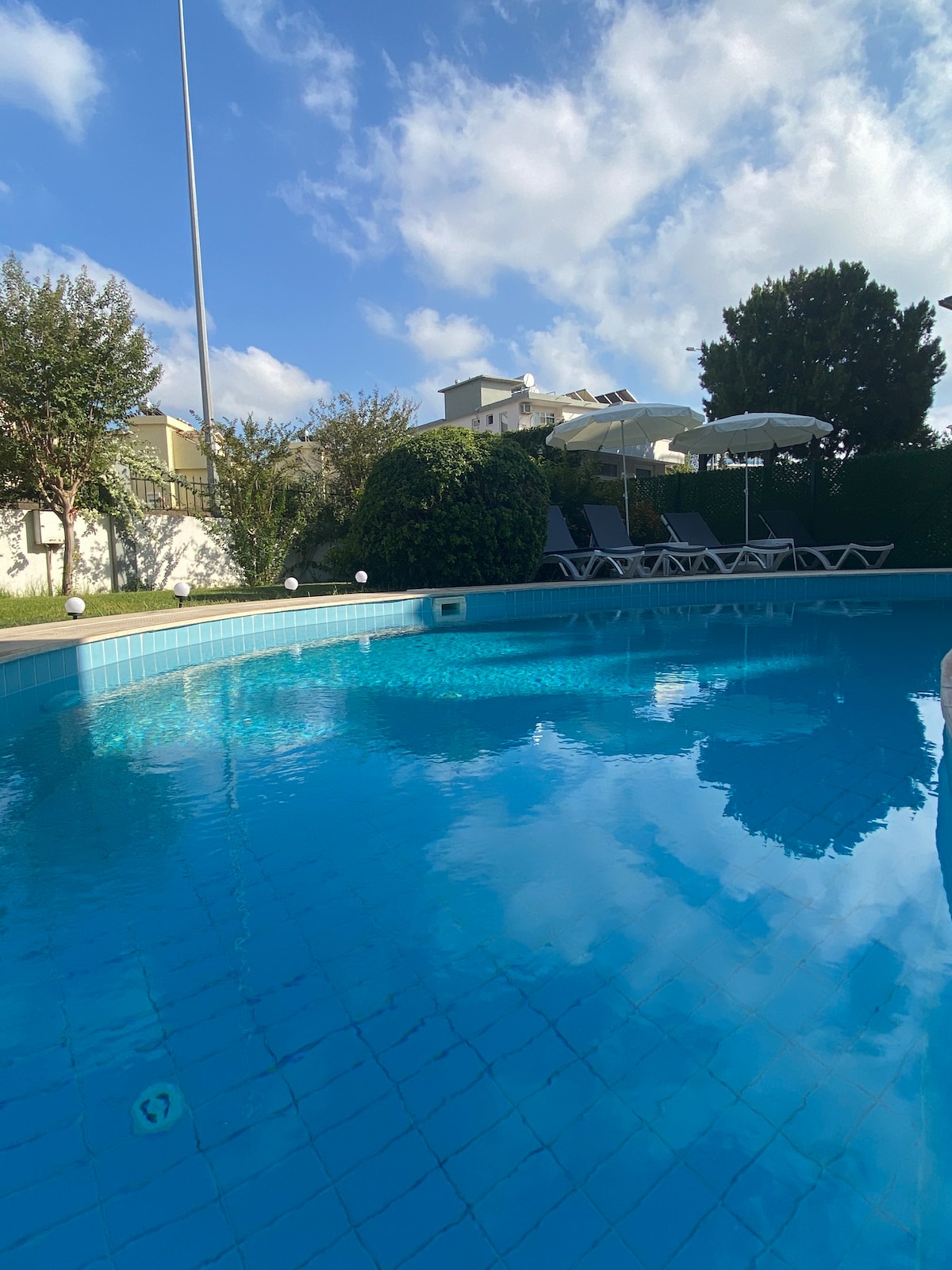 mükemmel bir site üzerinde havuz manzaralı güzel bir daire iki adet büyük yüzme havuzu vardır bütün odalar da klima vardır bir tane çift kişilik yatak ve çift kişilik yatak kalabilien çok rahat bir köşe takımı ve balkonda tek kişilik yatak olabilen koltuk ve kahve köşesi mevcuttur filtre kahve, türk ve kapsül kahve makinesi meyve sıkacağı mutfak robotu blendir , standmikser, çay makinesi tost Makinesi airfey bütün ev gereçleri mutfak takımları havlular nevresim takımı