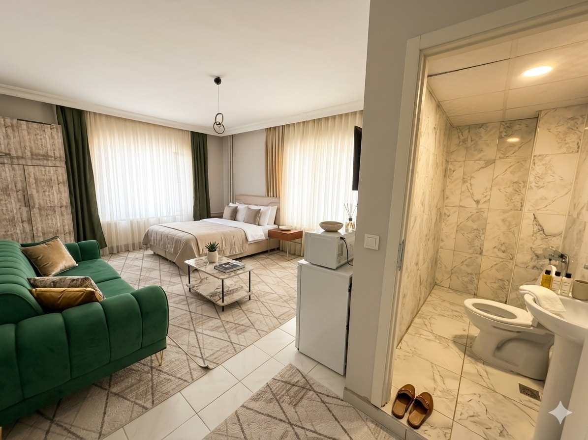 Şehir merkezinde yer alan dairemiz, tramvay ve dolmuş hatlarının önünden geçmesi sayesinde ulaşımda ayrıcalıklı bir konfor sunar. Emsal 1+0 dairelere kıyasla daha geniş ve ferah olan dairemiz, tamamı sıfır ve özenle seçilmiş eşyalarla modern ve lüks bir konseptte dizayn edilmiştir. Yüksek hijyen standartları, konforlu yaşam alanı ve merkezi konumuyla; ailece konaklamak isteyenler ve seyahatlerinde kaliteli, güvenli ve prestijli bir deneyim arayan misafirler için ideal bir tercihtir.