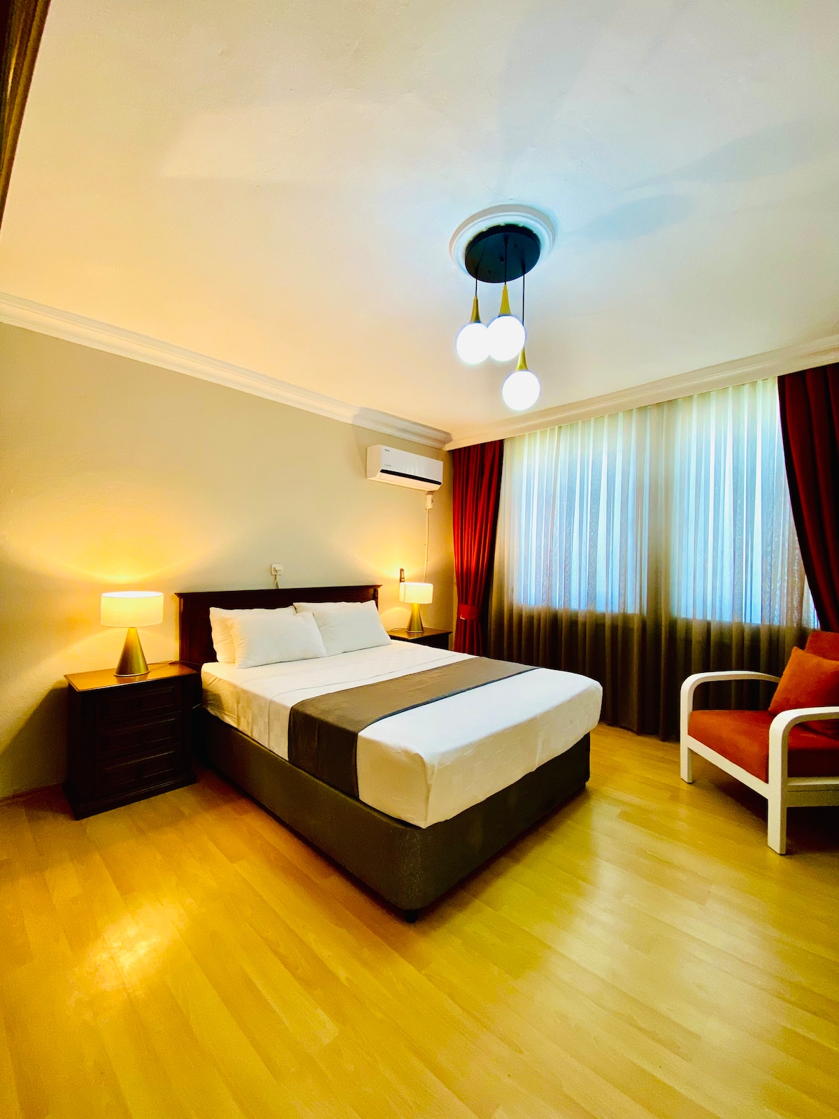 Bu 2+1 daire, 5 kişilik konaklama kapasitesi sunar. İki çift kişilik yatak odası ve geniş bir oturma alanı bulunur. Modern tasarıma sahip daire, geniş balkonu, doğalgazlı ısınma sistemi ve tam donanımlı mutfakta ocak, fırın, bulaşık makinesi ve çamaşır makinesi ile konfor sağlar. Otobüs durağı ve yerel pazar yakındır; denize ise 50 metre mesafededir. 7/24 resepsiyon ve güvenlik kameraları güvenliği artırır. Şehir merkezinde rahat bir konaklama için ideal!