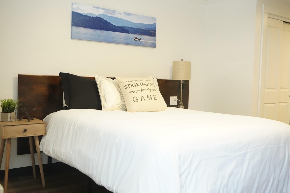 Freshly remodeled (2022) deer themed room at Lake Village Lodge. Convenient location, near downtown festivities and close to the freeway entrance for quick access to all the mountain, skiing, lake, river, and hiking CDA and the surrounding areas have to offer! This room has a queen bed and futon, So this can comfortably sleep 4. Great home base for all your Coeur d'Alene adventures. If you need more space, check out our suites and room 6 & 7 at Lake Village Lodge.