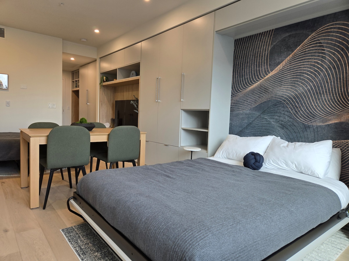 This studio is in the Crescent, the newest building on Red Mountain, just steps away from the lift. The space has been designed to make your stay comfortable, including a fully equipped kitchen, in suite laundry, and a work space. Just outside the unit, there’s a secured locker to store your gear. Building amenities include a gym, a bright co-working space, and beautiful indoor and rooftop lounges. There's also underground parking, which means less time cleaning off snow after a pow-day!