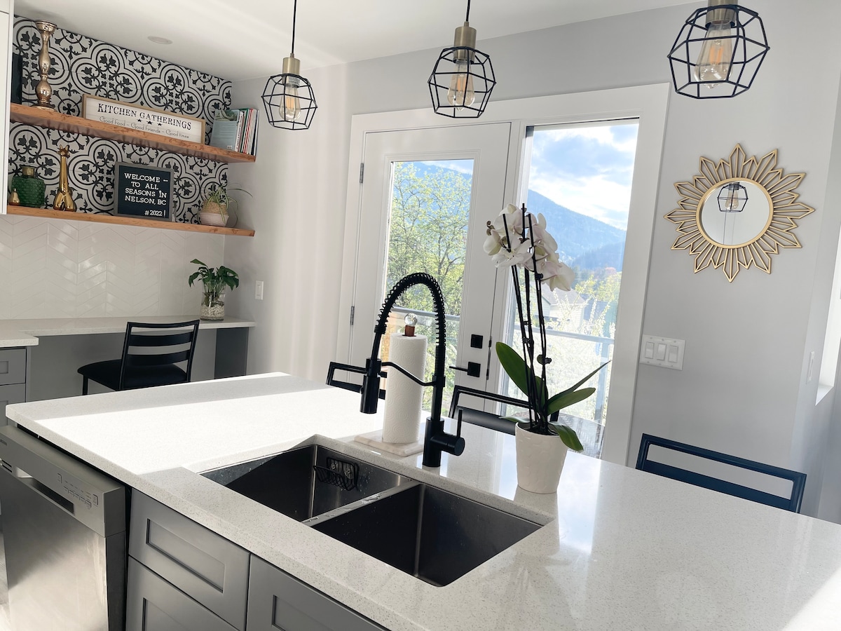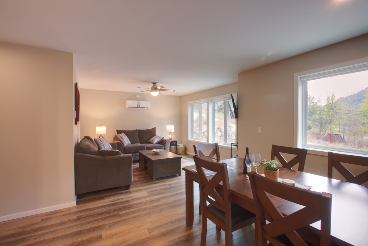 Enjoy spectacular mountain and lake views at our peaceful paradise just 10min from Nelson. Pet friendly! Two large bedrooms, clean modern finishes, warm in-floor heat, soaker tub and shower in the bathroom. A fully appointed kitchen with eating bar makes for fun social hour at the end of your busy day or a great way to start the day. Open concept including dining table and couches to sit back and relax while visiting with each other and an outdoor covered dining option. Outstanding views!