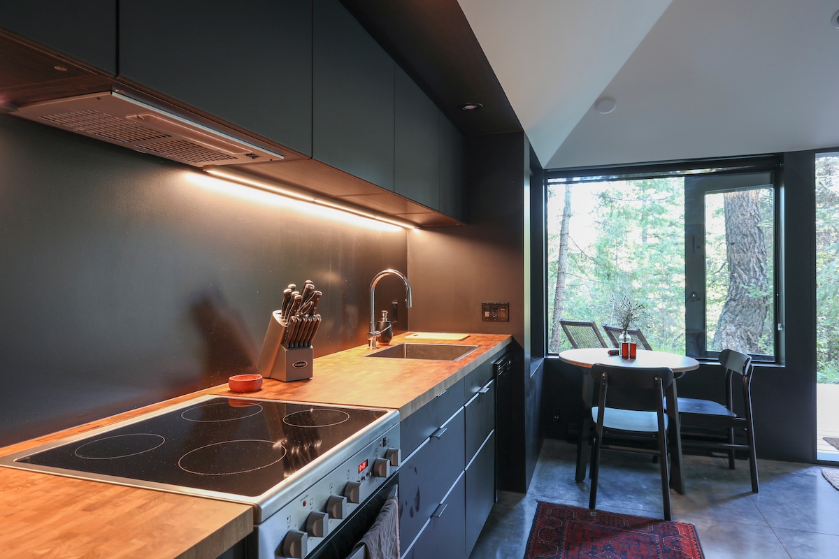 Kick off your shoes and take in the serene view at our cozy hilltop suite. Enjoy a kitchen stocked with every comfort you expect, plus specialty coffee equipment you’ll love. Wind your way across the road and down the trail to our private sandy beach, and roast some marshmallows on the campfire while you’re there. Novelty and adventure are nearby: only 3 minutes to Nelson, 28 minutes to Whitewater Ski Hill, and 1 minute to Lyons Bluff hiking trail.