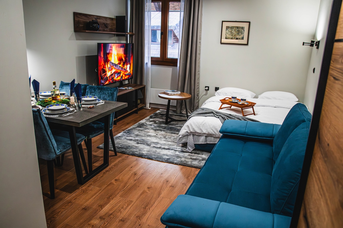 Equipped with high-quality furniture pieces and designed for relaxation and comfort, Cozy Lodge features a modern elevated King size bed for exceptional comfort, all aimed at making you feel cozy and welcomed. The apartment also includes a kitchen with all necessary utensils, a refrigerator, oven, microwave, a two-burner stove, as well as a table for work and dining. Towels, bed linens, a hairdryer, an iron, and toiletries are provided, so you don't have to worry about that.
