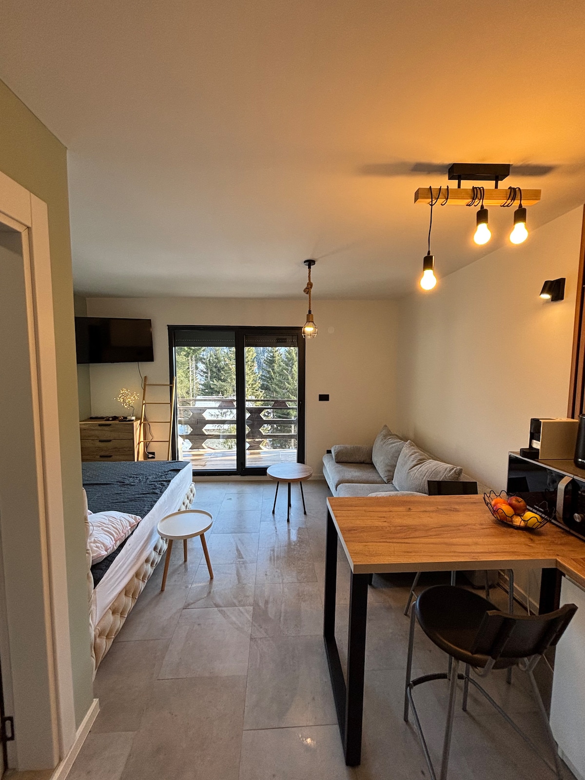 Udoban, moderan sa potpuno opremljenom kuhinjom i terasom sa koje se pruža predivan pogled. Ski bus-a je preko puta ulaza, restoran i SPA su povezani toplim hodnikom. Popust za SPA u zimskoj sezoni je 50%. Prodavnica i odlična picerija su preko puta ulice, velika samoposluga udaljena oko 500m Želim vam boravak ispunjen smehom i nezaboravnim trenucima !