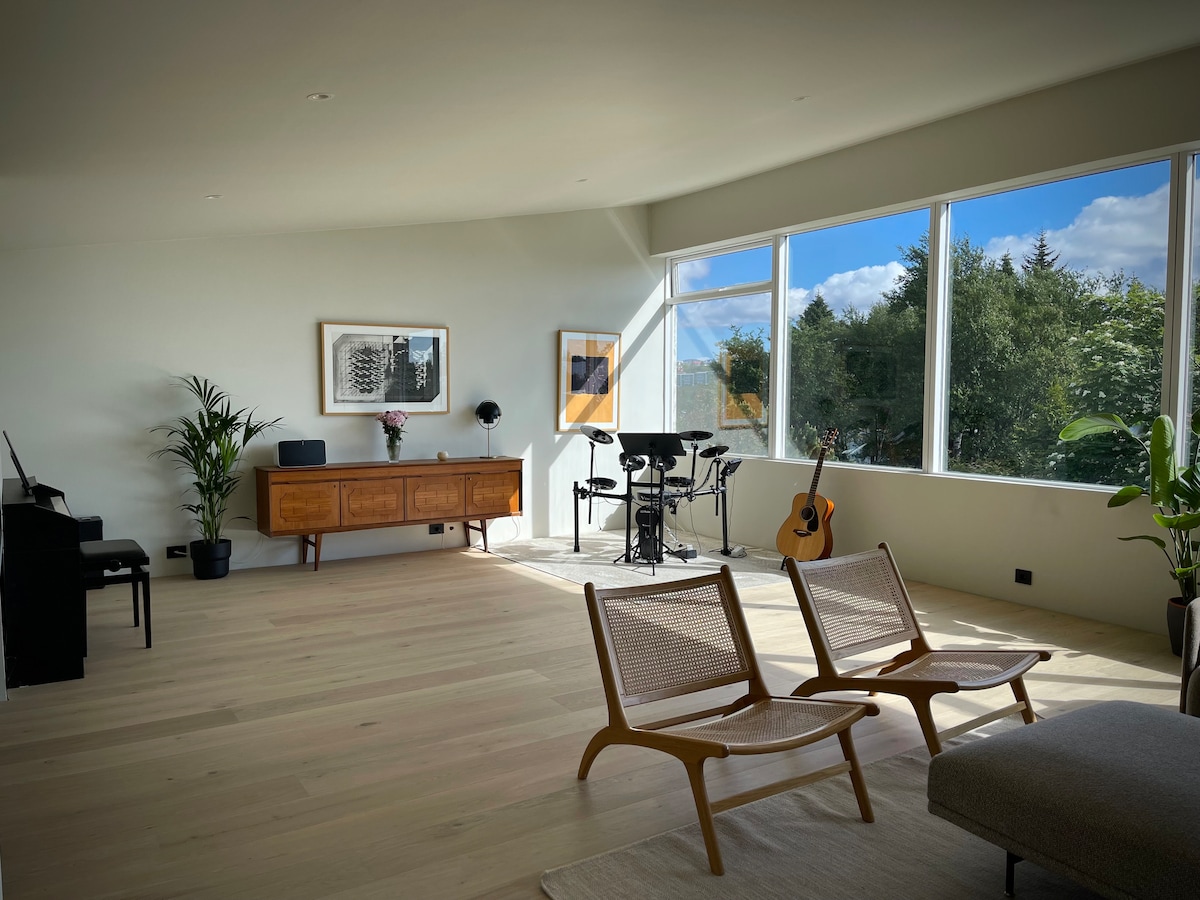 A well located California style Mid-Century modern property for small groups and families. Nice open living room with large windows, adjacent to dining room and kitchen. Three balconies, living room balcony with view towards ocean, kitchen balcony with view over Mount Esja. Our guests love: - Architecture and views - Short 5-10 minute drive to the city - Quiet residential neighborhood - Free parking Bus stops right outside (no 14), to downtown area Gray Line bus terminal is close by