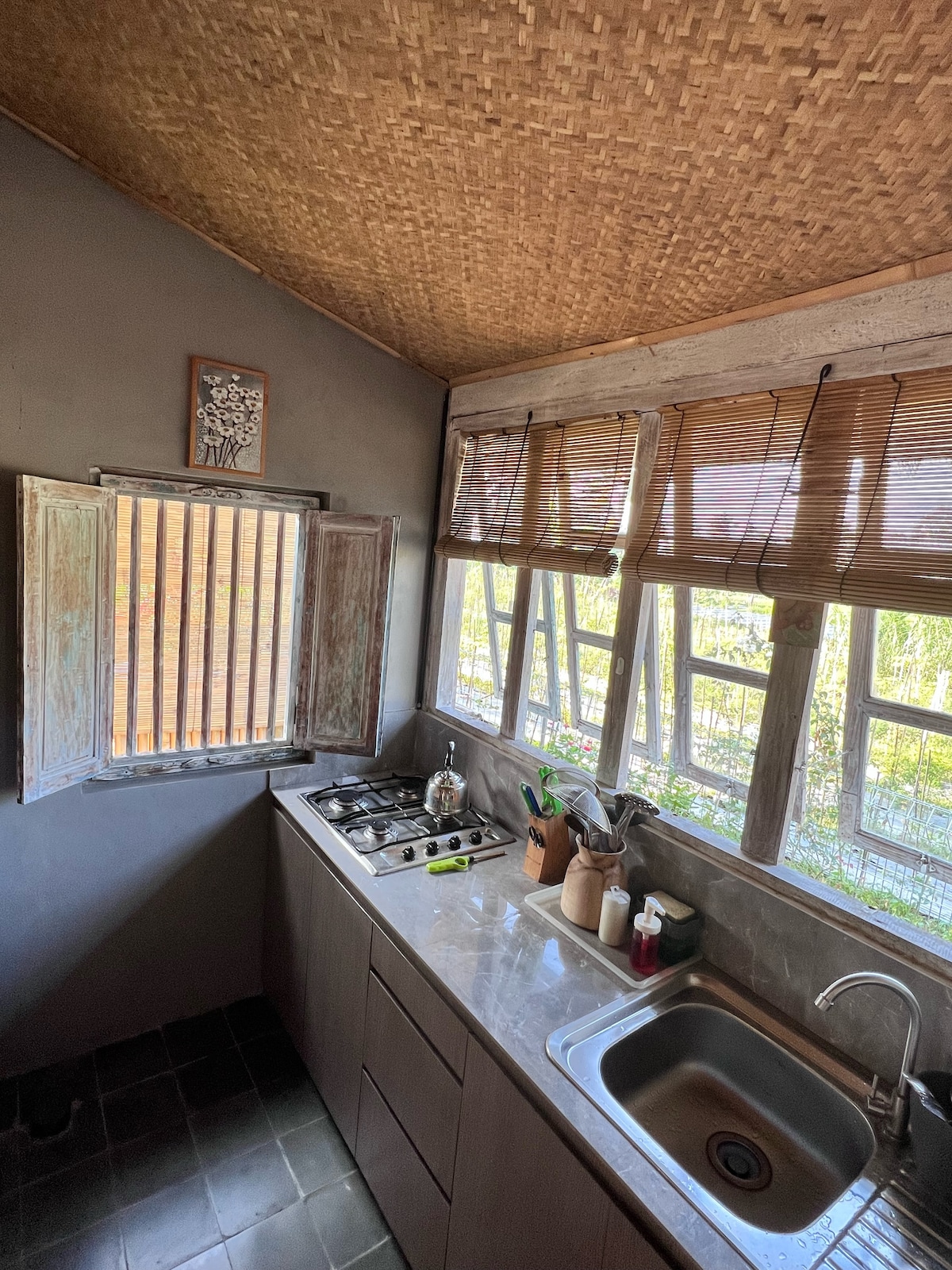 Nestled in the heart of lush rice fields at the foothills of Mount Merapi, this cozy wooden cottage offers a truly authentic village living experience. Wake up to fresh mountain air, the gentle sound of flowing water, and breathtaking views of Merapi right from the house. The cottage features two bedrooms and one shared bathroom. At the back of the house, enjoy a grassy yard and a small fish pond, perfect for relaxing, morning tea, or simply watching the day go by.