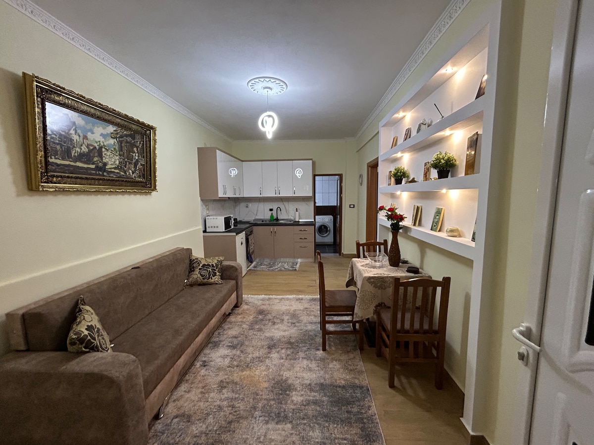 We welcome you in this cozy garçonnière in the centre of Korçë, at a walking distance from Parku Rinia, Skënderbeu Stadium, Lëndina e Lotëve and just a promenade away from the majestic Orthodox Cathedral and the lively Old Bazaar. Strategically situated near the Main Bus Terminal of South Albania, it is also close to supermarkets, pharmacies, a post office and especially bakeries, where you can taste delicious Albanian treats!