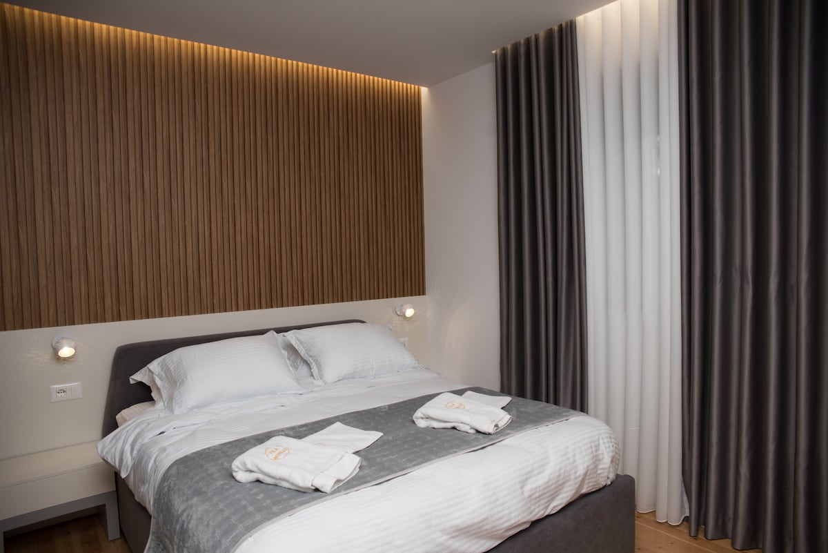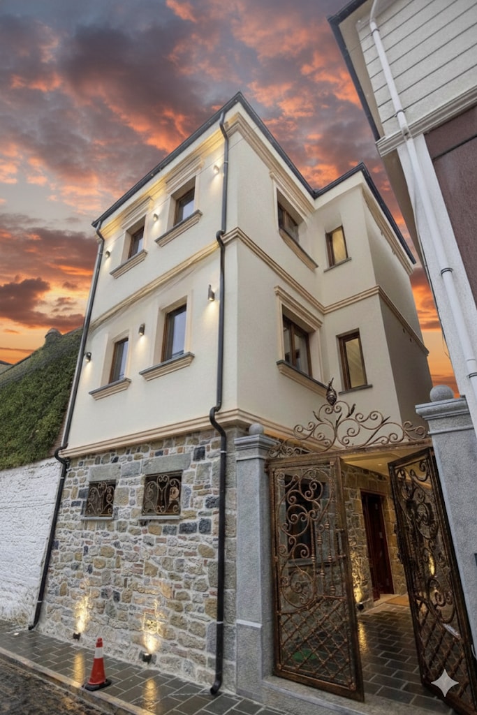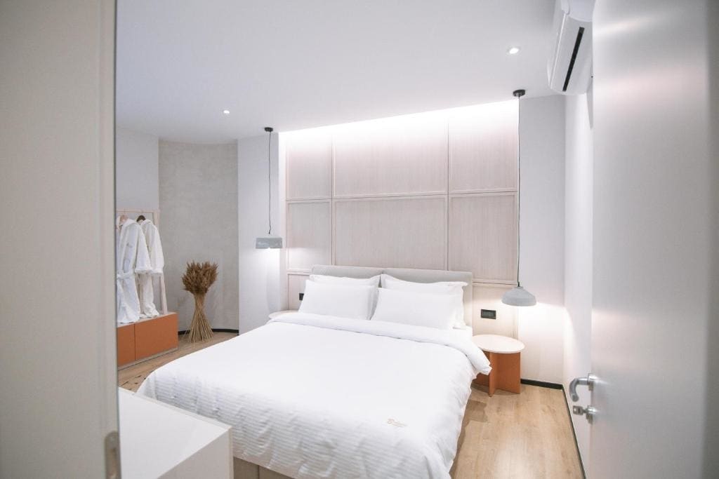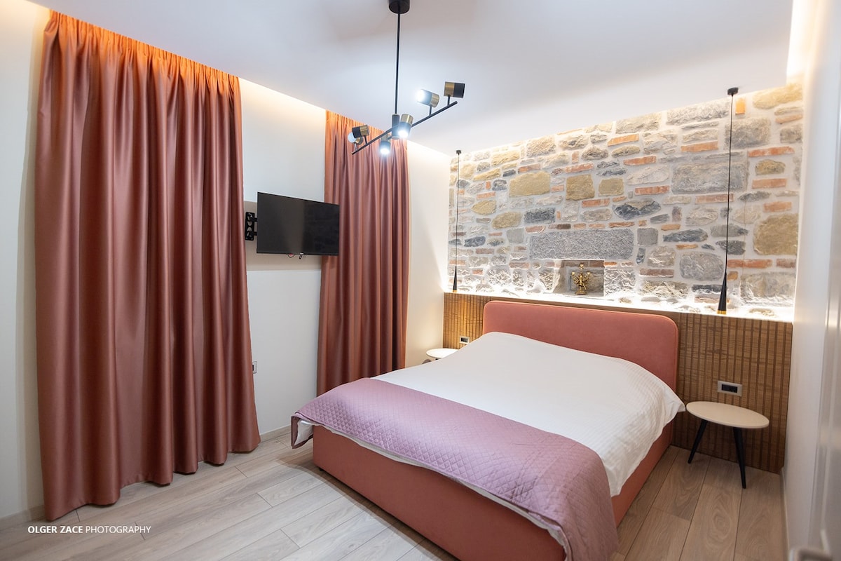 Nestled in the heart of Korçë, Moonlight Serenade Villa offers a cozy retreat perfect for couples or solo travelers. Inspired by the city's rich serenade history enjoy stylish comfort, modern amenities, and breathtaking city views 🌇. This stylish bedroom features a plush double bed, perfect for a restful night's sleep. The stunning exposed stone accent wall, softly illuminated by warm ambient lighting, adds a touch of character and sophistication.💆🏻🌟