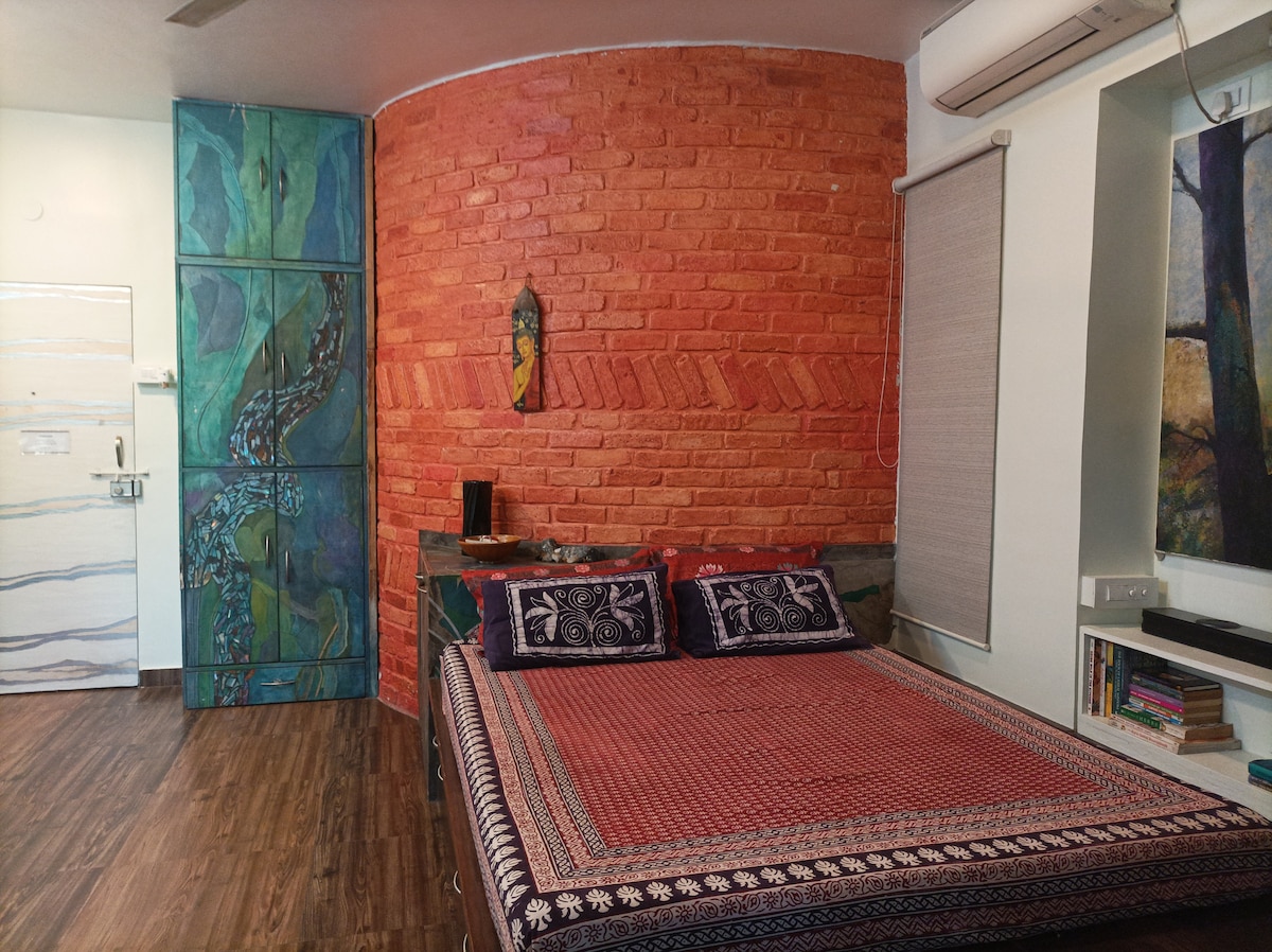 This unique place has a style of its own. Enjoy our centrally-located place. Minutes away from all nightlife & attractions of Kalyani Nagar and KP ( Koregaon Park). This is a spacious private Apartment with a spacious living room, 1 bedroom w/ queen size bed, a closet, and a spacious modern bathroom with tankless water heater (for never ending hot water) Kitchen has a small refrigerator & iduction w/ utensils