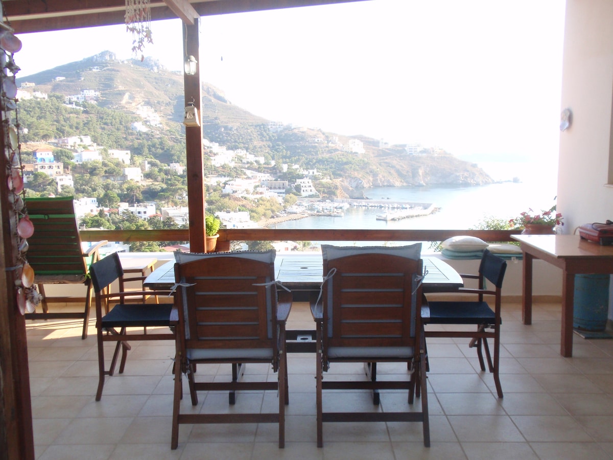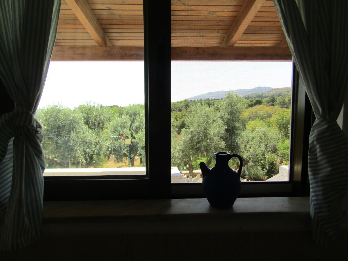 Studio on the first floor, in shades of blue, inspired from the beach. With a loft-bed for 2 love birds and a view looking straight to the valley and the smaller islands closer to us.