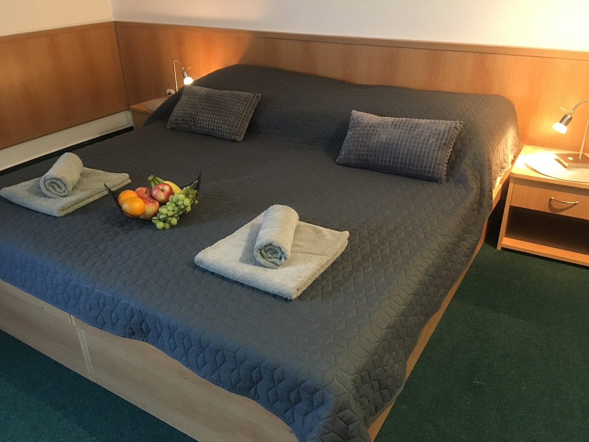 Útulnú podkrovná izba s manželskou posteľou alebo dvoma oddelenými posteľami a gaučom v blízkosti centra mesta. Vybavenie izby: veľkosť izby 25 m2 dvojlôžková posteľ a gauč mini bar (chladnička) možnosť prístelky za príplatok vlastná kúpeľňa s vaňou a WC uteráky a osušky WIFI bezplatne na izbe LCD TV so satelitným vysielaním