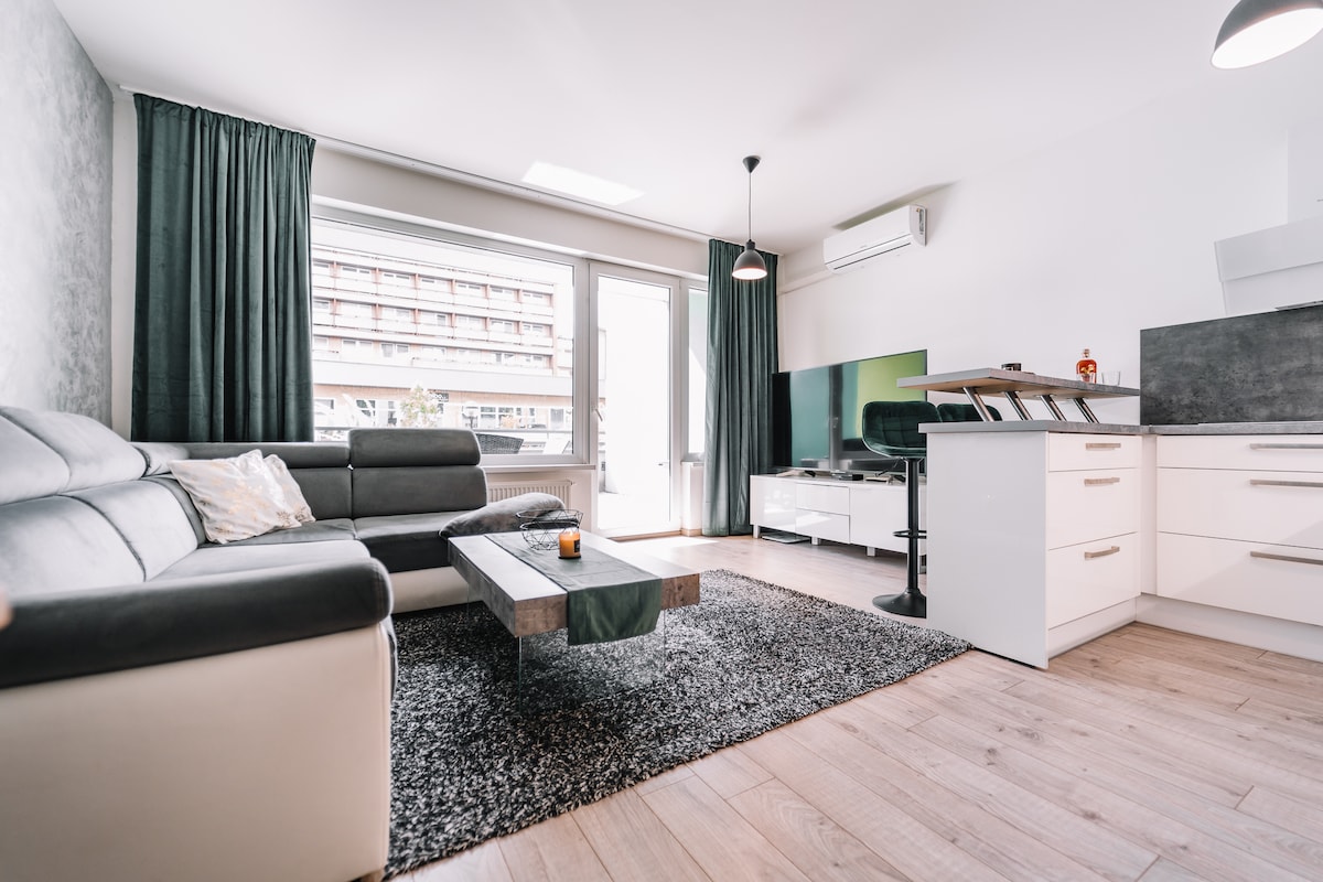 Your new stylish apartment offers comfort stay for up to 2 persons. It is located in a new estate just minutes within downtown. Place is fully furnished (kitchen appliances, wi-fi, Antik Smart TV, etc.) and is ready for your stay. Free parking is provided in designated underground space. Safety of the property and guests is provided by private security company.