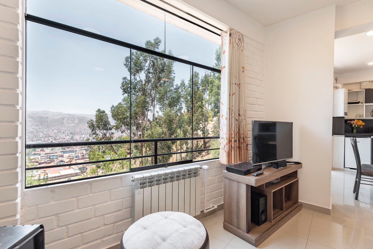 A tres cuadras de la plaza de Armas de Cusco, en el barrio tradicional de San Blas está el Mini departamento completamente privado y equipado con cocina, comedor,baño, dormitorio, chimenea, ventanal, neflix, wifi (fibra óptica) y una terraza en el jardín de la casa. Cuenta con servicios las 24 horas y goza de la paz del bosque localizado detrás del dormitorio principal. Forma parte de una casona tradicional de tipo colonial -Casita Azul-de adobe, paredes blancas con puertas y balcones azules