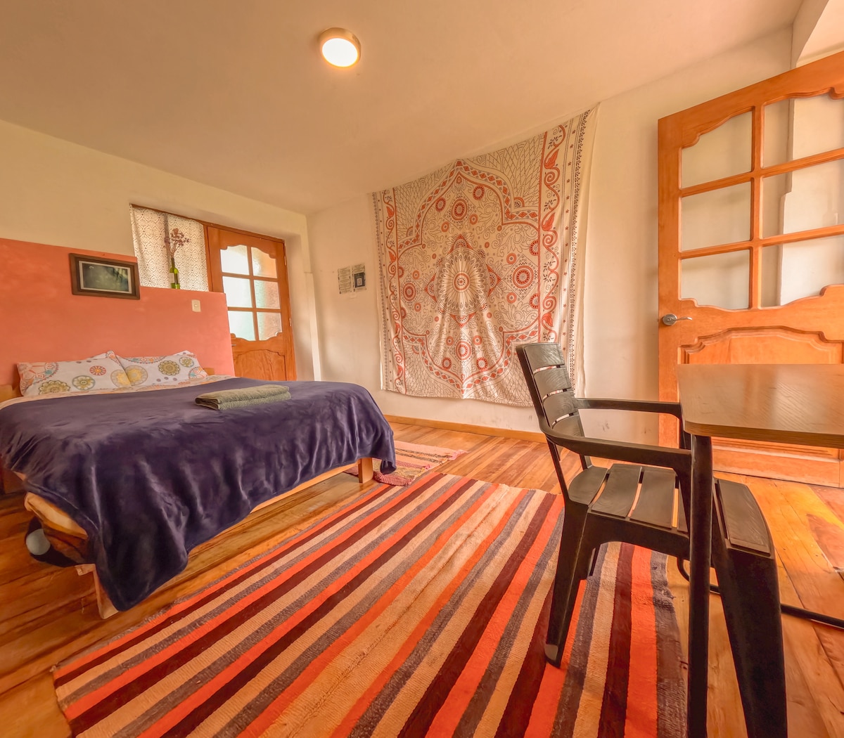 Designed for active travelers, the bungalow has stunning views of the Sacred Valley and Pisac. Located on a spacious property at the base of mountain Apu Linli, guests enjoy birds, native plants, gardens and hiking from this serene setting. The living space and kitchen are ideal for two couples, a family, or a group of friends. Guests arrive by walking 20-min from Pisac or taking a 5-min mototaxi from town along Incan corn terraces and walking the final 100 meters uphill to the property gate.
